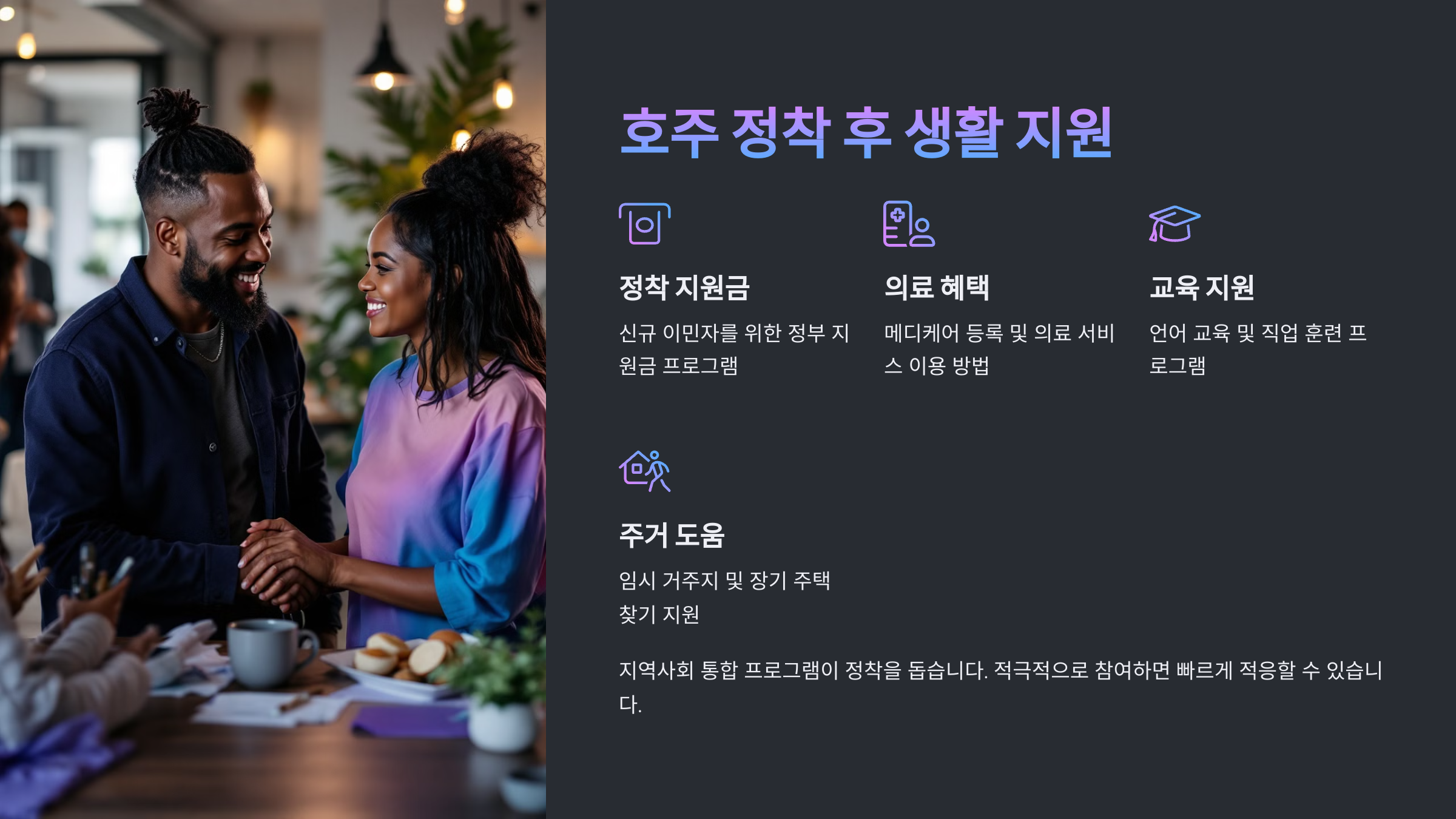 주택 관련해서는 'Centrelink'를 통해 저소득층을 위한 임대료 보조 프로그램이 있어요. 특히 자녀가 있는 가정이나 나이가 많은 부모 세대는 우선순위에 포함되기도 해요. 정착 후 초기 몇 개월 동안은 언어 장벽이나 문화 차이 때문에 불편함이 있을 수 있지만, 다양한 커뮤니티와 한인 네트워크 덕분에 빠르게 적응할 수 있어요 😊